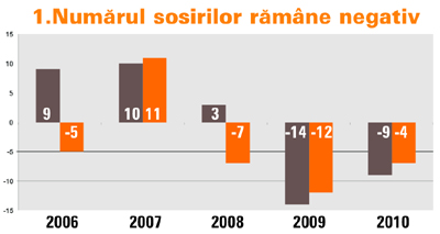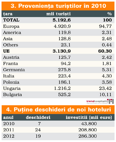 Topul tarilor de origine ale vizitatorilor contorizati la granitele romanesti si-a pastrat relativ aceeasi ordine (vezi grafic 3), cu mici variatii, astfel: europeni in proportie de aproape 95%, din care preponderent unguri si bulgari. Capacitatea de cazare in structuri hoteliere a ramas, de asemenea, relativ nemodificata in 2010 (vezi grafic 4), cele mai multe dintre proiectele anuntate fiind suspendate sau amanate, altele chiar anulate. Proiecte noi nu au mai fost initiate in conditiile in care lipsesc sursele de finantare eficiente pentru aceste tipuri de investitii. Anul 2010 nu a adus nici o schimbare, putine proiecte, aflate intr-un stadiu avansat de investitie, reusind sa-si definitiveze constructia si pregatirea pentru deschidere. „Pentru urmatorii 3-5 ani sunt pastrate in agendele dezvoltatorilor mai multe proiecte de structuri de cazare, unele conservate de cativa ani, altele amanate si putine evaluate si decise in ultimii doi ani, proiecte cu o larga distributie geografica, investitii care ar putea completa capacitatea hoteliera nationala cu peste 7.000 de camere”, precizeaza Paul Marasoiu.