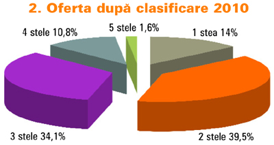 Hotelurile de 2 si 3 stele au ramas in continuare preponderente in piata, criza implementand o preferinta a turistilor pentru hotelurile de 3 si 4 stele, in special pentru deplasari in interesul firmelor. Ponderea turistilor straini cazati in hoteluri de 3 stele din Romania este de peste 30% din total (in crestere pronuntata, odata cu cresterea capacitatii de cazare pe aceasta categorie), iar in hoteluri de 4 stele ponderea strainilor se situeaza la cca 40%, durata medie a sederii fiind intre 1,7 si 2,5 zile, tipic pentru sejururile urbane de afaceri.