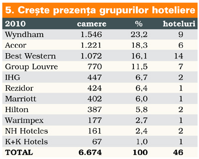 In ceea ce priveste hotelurile mici versus cele afiliate, care, de altfel, sunt in crestere (vezi grafic 5), performanta lor este diferita, mai precis toate proprietatile cu brand au performat cu cel putin 30% peste cele independente, ca venituri generale. „Incapacitatea manageriala, lipsa procedurilor, inexistenta unei politici tarifare, a unei strategii de vanzare, a unui concept al produsului hotelier, a fortei de munca corect selectionate, au pus in dificultate afacerile independente inca de la primele semne ale crizei economice, aceste tipuri de hoteluri fiind cele mai vulnerabile”, este parerea lui Paul Marasoiu. In 2010 nimic notabil privind tranzactii pe piata hoteliera nationala. Ceea ce se numeste „hospitality real estate” in Romania nu reprezinta inca o piata structurata si care sa aiba o masa critica de proprietati valide pentru tranzactionare.