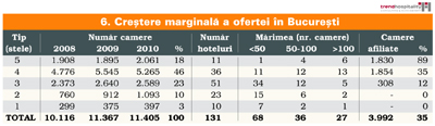 Scaderea tarifelor si a gradului de ocupare in Bucuresti se explica nu numai prin reducerea cererii, cauzata de criza economica, ci si prin faptul ca in anii de crestere economica numarul de camere de hotel din Bucuresti a crescut, fiind deschise noi hoteluri, printre care si cele de mare capacitate, Radisson Blu si Ramada Plaza, sau de capacitate foarte mare, precum Grand Rin (vezi grafic 6).