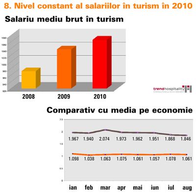 Din punct de vedere al ofertei de munca, industria hoteliera este una care poate sa absoarba inca foarte mult, avand in vedere ca si salariile sunt in usoara crestere in acest domeniu (vezi grafic 8). Problema este calitatea, nu neparat cantitatea ofertei de munca. „Eu am sustinut intotdeauna ca nu avem niste servicii dezastruoase, ci chiar normale, dar pana la urma depinde si cu ce le compari. Nu trebuie sa fim negativisti, pentru ca vina pentru serviciile slabe calitativ nu o poarta neaparat personalul, ci este vechea problema, faptul ca nu avem scoli vocationale.