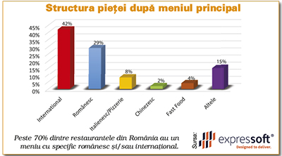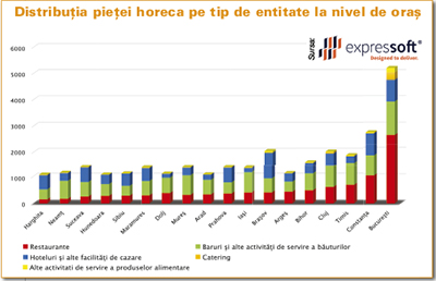 Conform cercetarii de piata realizata de catre compania Expressoft reiese ca, in Romania, predomina numarul barurilor si a altor localuri de servire a bauturilor (pub-uri, cluburi, cafenele), si nu cel al restaurantelor (vezi grafic). „Bucuresti, Constanta si Arges sunt singurele orase din Romania in care numarul restaurantelor este mai mare decat numarul barurilor. In Bucuresti, 51% din totalul entitatilor este reprezentat de catre restaurante“, spune Bianca Iovu, marketing manager al companiei Expressoft.