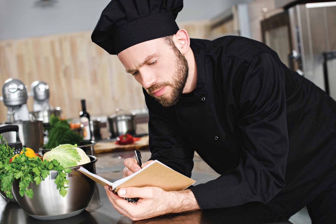 side view of handsome chef writing down new recipe to notebook at restaurant kitchen