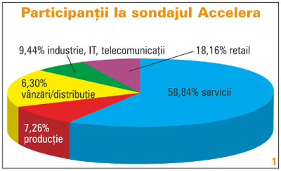 Cel mai recent studiu realizat de Accelera a avut ca intrebare centrala – Care este perspectiva oamenilor de afaceri asupra crizei economice din 2010, dupa anunturile facute de Guvern? Studiul a fost realizat pe un numar de 513 de companii, care activeaza in majoritate in domeniul serviciilor si au intre 50 si 100 de angajati (vezi grafic 1). Dintre cei chestionati, aproape jumatate au inregistrat cresteri ale vanzarilor in anul 2009 si doar o treime s-au confruntat cu scaderi.
