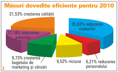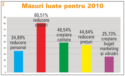 Reducerea costurilor a fost cea mai aplicata masura (80% dintre companii) pentru 2010. De asemenea, jumatate dintre companii au fost nevoite sa scada preturile pentru a veni in intampinarea nevoilor clientilor, doar 35% au apelat la reducerea de personal ca solutie pentru anul 2010 si peste 25% dintre companii si-au crescut bugetul de marketing si vanzari pentru a-si imbunatati vanzarile (vezi grafic 2).