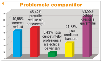 Care sunt insa cele mai mari probleme care impiedica companiile sa realizeze o crestere mai mare a vanzarilor in 2010? Din sondajul Accelera reiese ca politica gresita a Guvernului este considerata principalul element care blocheaza dezvoltarea acestora, pe locul doi, respectiv 45% dintre companii resimt efectul concurentei crescute pe piata si a scaderii preturilor, urmat indeaproape de scaderea nivelului de trai si de lipsa creditelor (vezi grafic 4).