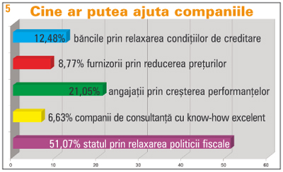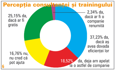 Cea mai mare parte sunt de parere ca statul, prin relaxarea politicii fiscale, ar fi primul care ar putea sa-i sprijine pentru a obtine performante mai bune in 2010. De asemenea, conditiile mai bune de creditare din partea bancilor si reducerea preturilor din partea furnizorilor ar aduce un aport in sprijinul acestor companii. 21% dintre companii considera ca au nevoie de o crestere a performantelor profesionale ale salariatilor pentru a reusi sa se descurce in 2010 si doar 6,63% dintre companii sunt constiente de faptul ca o firma de consultanta specializata le poate ajuta sa isi creasca veniturile in acest an (vezi grafic 5). Totusi, 58,09% dintre companii ar plati pentru servicii de consultanta pentru a se apara de efectele crizei, 16,76% dintre companii nu cred in eficienta serviciilor de consultanta, 25% ar apela la astfel de servicii daca ar fi pe gratis si doar 18,52% deja le utilizeaza (vezi grafic 6).