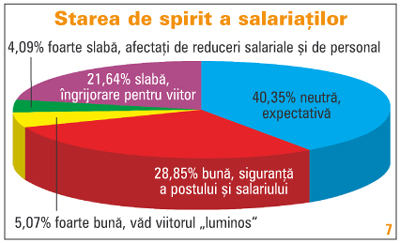 Din pacate, nivelul scazut de motivare a personalului afecteaza foarte puternic productivitatea companiilor si le pune in pericol rezultatele. 28,85% dintre salariati se simt siguri pe postul lor si pe salariile lor, 40% au o stare de expectativa, in timp ce peste 25% sunt ingrijorati sau foarte ingrijorati pentru viitorul lor (vezi grafic 7). Astfel, daca vor o crestere a veniturilor, companiile vor trebui sa apeleze la specialisti in motivarea personalului.