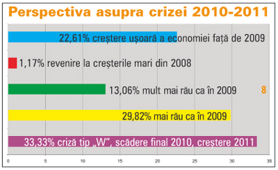 Ca o concluzie a acestui sondaj, previziunea economica pentru anii 2010 – 2011 a participantilor este majoritara pesimista: 42,88% dintre companii prevad ca anul 2010 va fi mai rau sau mult mai rau decat in 2009, 33,33% prevad o criza de tip W cu o revenire importanta in 2011 si doar 22,61% prevad ca situatia in 2010 va fi un pic mai buna decat in 2009 (vezi grafic 8).
