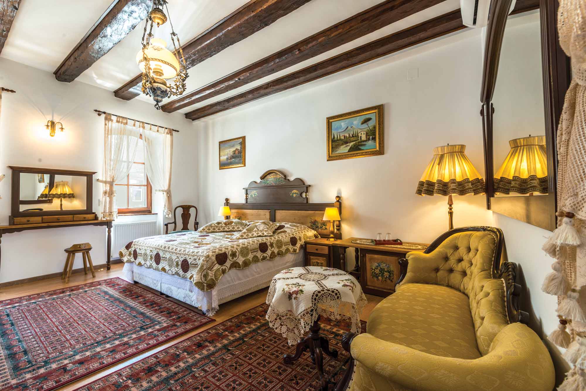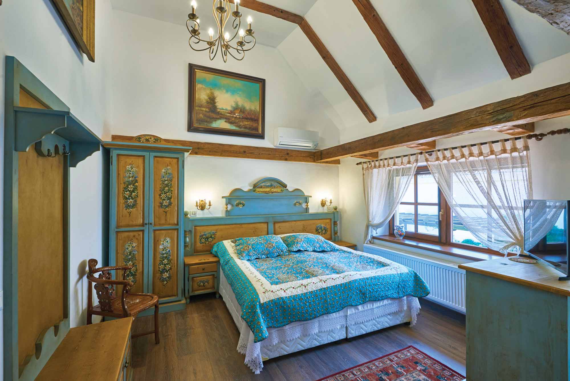 In realizarea designului s-a luat in considerare pastrarea aspectului anilor 1900, regasindu-se parca in aerul camerelor aroma vremurilor in care excesul era o normalitate. Mobilierul a fost, in parte, autentic reconditionat si, respectiv, in parte, confectionat de mesteri locali. Toate picturile, atat de pe mobilier, cat si din locatie au fost realizate manual si reprezinta scene din viata satului. Culorile sunt calde, in incercarea de a lasa cat mai mult lemnul sa vorbeasca de la sine.