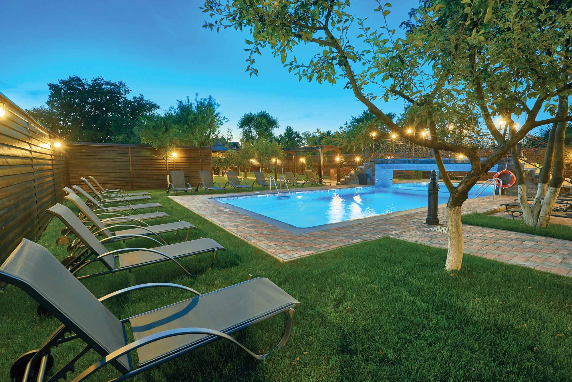 Piscina interioara, construita in crama cladirii, este un exercitiu arhitectural interesant intrucat s-a reusit imbinarea fundatiei din caramida cu tehnica de ultima ora pentru ventilatie si ionizarea apei. Piscina exterioara cu apa sarata este conceputa atat pentru adulti (180 cm adancime), dar si pentru copii (70 cm adancime in zona de copii). Foisorul pentru ceremonii, precum si locul pentru foc de tabara completeaza peisajul idilic.