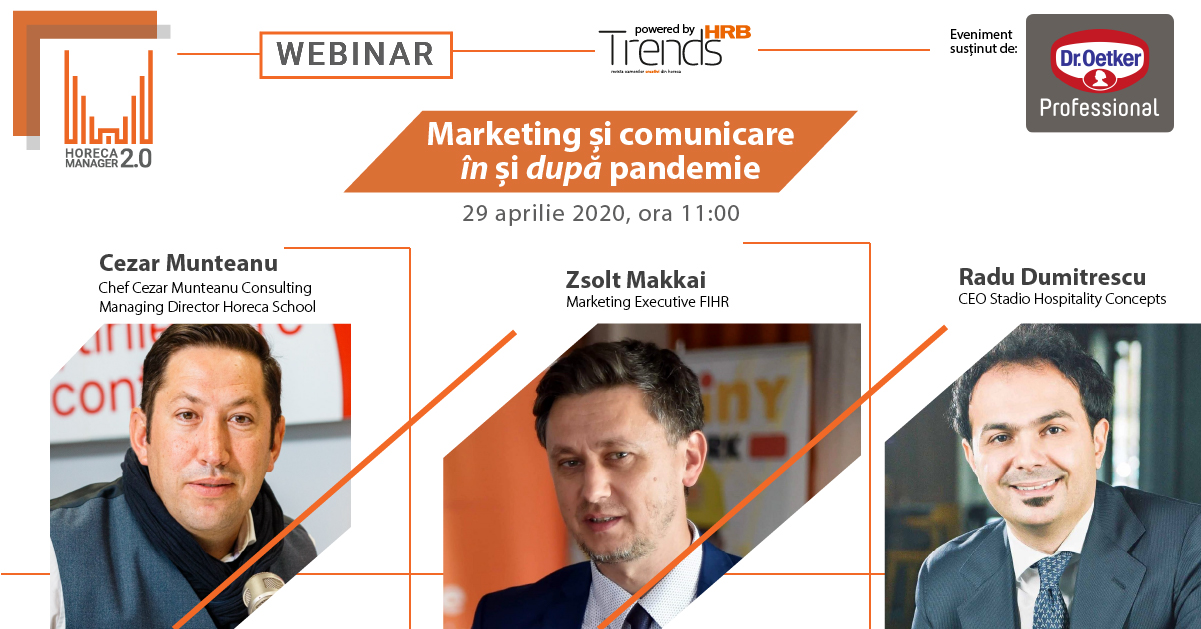 Trends HRB continuă seria de webinarii Horeca Manager 2.0, cu o nouă temă de interes pentru toți profesioniștii din industria ospitalității: „Marketing și comunicare în și după pandemie”.Încă de la debutul crizei provocate de pandemia de COVID-19 s-a rostit sintagma „nimic nu va mai fi la fel”. Totul va fi reinventat și redefinit, de la propriile priorități și valori până la strategiile companiilor și funcționarea unor sectoare întregi de activitate.