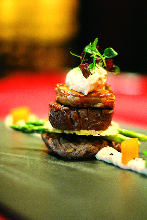 Medalionul de vita se condimentateaza si prajeste, fiind gatit la abur, la de 62,50C. Sotati ficatul de gasca in unt si adaugati smantana 35%. Asezonati cu ardei verde afumat, nucsoara, sare Maldon, ingrosati sosul cu gelpressa. Faceti sosul emulsie ti turnati-l intr-un sifon special pentru crema. Aplicati doua doze de N2O. Curatati si taiati bulbii de telina si salote, sotati-i in unt pana se inmoaie, fara sa isi piarda culoarea! Adaugati smantana 35%, amestecati cu un blender de mana. Pentru jeleul de porto, infuzati vinul de porto, curmale proaspete si condimente. Utilizati gelatina vegetala, pentru a solidifica lichidul si turnati-l pe o foaie de silicon.