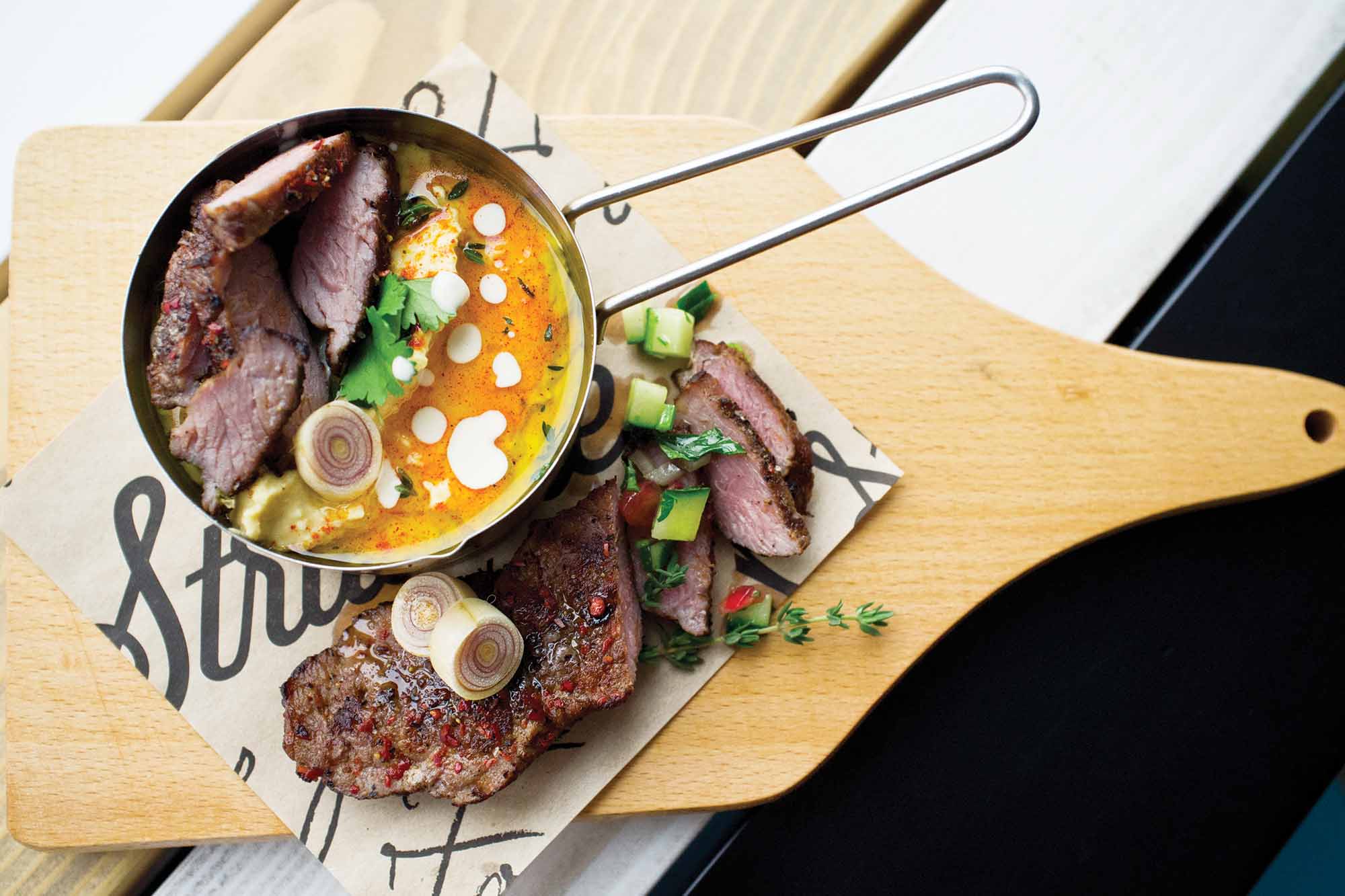 150 g de năut fiert, 60 g de tahini, 10 ml de zeamă de lămâie, 10 g de usturoi, 15 ml de ulei de măsline extravirgin, 15 g de lemongrass, 5 g de chimen, sare grosso, după gust, piper, după gust, 200 g de antricot de vită, piper verde, după gust, 5 g de boia afumată.