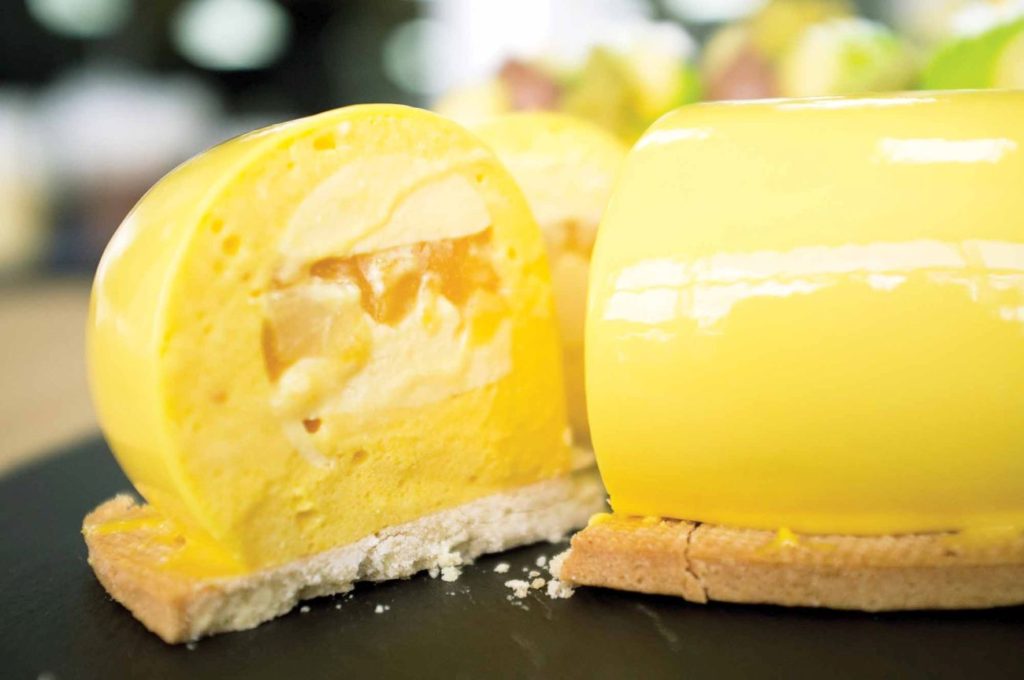 - Mango mousse: 500 g piure de mango, 30 g gelatină, 400 g bezea italiană, 200 g frișcă semibătută. Se hidratează gelatina. Piureul de mango se încălzește la 60˚C și se adaugă gelatina. În compoziția răcită la 40˚C se adaugă bezeaua și frișca. Se toarnă mousse-ul în forma de silicon, se adaugă inserția de maracuja și se acoperă cu un blat subțire. Se pune la congelator. Se scoate și se decorează.