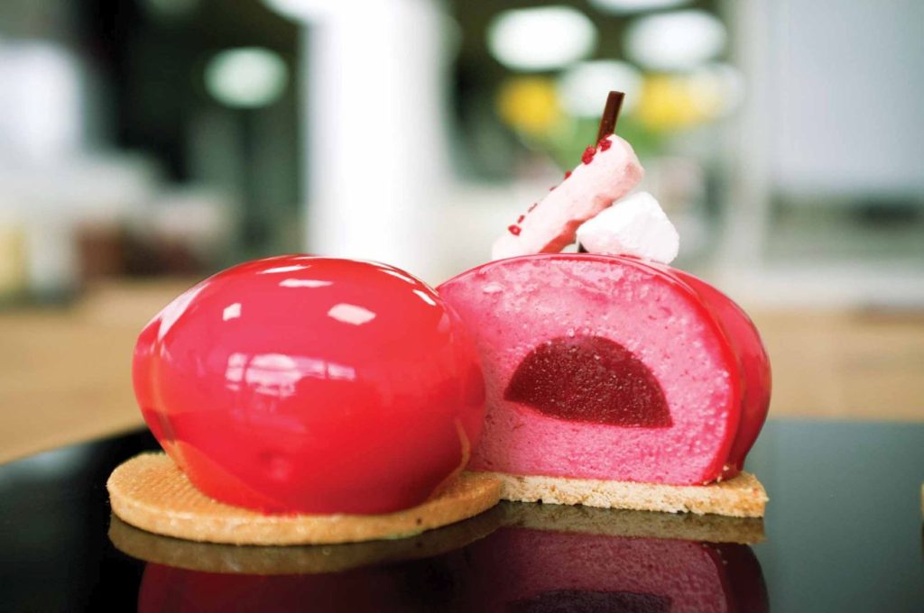 - Mousse de zmeură: 250 g piure de zmeură, 10 g gelatină, 150 g frișcă semibătută, 50 g bezea italiană. Gelatina se hidratează. Piureul se încălzește la 60˚C. Se adaugă gelatina, bezeaua și frișca. Se toarnă în formele de silicon, se adaugă inserția de jeleu și se acoperă cu un capac de blat. Se pune la congelator. Se scoate și se decorează.