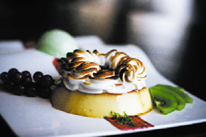 Se spumeaza ouale cu zaharul, la robot, se amesteca impreuna cu laptele, incalzit in prealabil, se arde zaharul, dupa care se muleaza formele, in care se pune crema. Se introduc la cuptor in bain-marie si cand sunt gata se pun la frigider. Fructele de padure se caramelizeaza in unt, cu zahar. Batem albusurile cu zahar farin incalzit la cuptor. Se demuleaza formele de crema, se pun in top fructele caramelizate si se acopera cu bezeaua, pe care o ardem cu lampa. Se monteaza pe farfurie inghetata, alaturi de decor.