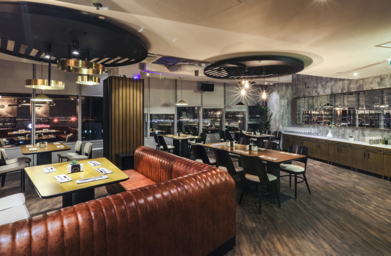 Cu o vedere panoramică asupra întregului oraș, una din particularitățile de design o constituie indicatoarele de pe tavan care poziționează, la 360 de grade, principalele repere arhitectonice din București.