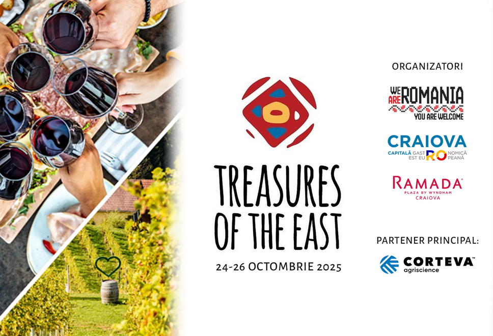Festivalul „Treasures of the East”, organizat de platforma „We are România. You are Welcome”, alături de „Craiova, capitală Gastronomică Est- Europeană” și Ramada Plaza Craiova, va reuni, în perioada 24-26 octombrie 2025, atât profesioniști din domeniul vinului, ospitalității și turismului, cât și publicul larg interesat să afle despre vin, gusturi și oportunități de turism în regiune. Festivalul va avea loc la Hotelul Ramada Plaza Craiova.